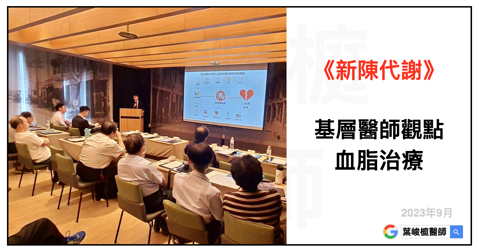 《新陳代謝》基層醫師觀點的血脂治療 發佈留言 / 新陳代謝 (Metabolism), 演講全記錄 (Speech), 糖尿病 (Diabetes), 體重管理 (Weight management) / 葉峻榳 血脂異常跟心血管疾病有關,如果合併糖尿病、腎臟病,不僅生活品質下降,壽命也會大打折扣。近期,我受中華民國基層醫 […] 《新陳代謝》基層醫師觀點的血脂治療 閱讀全文 »
