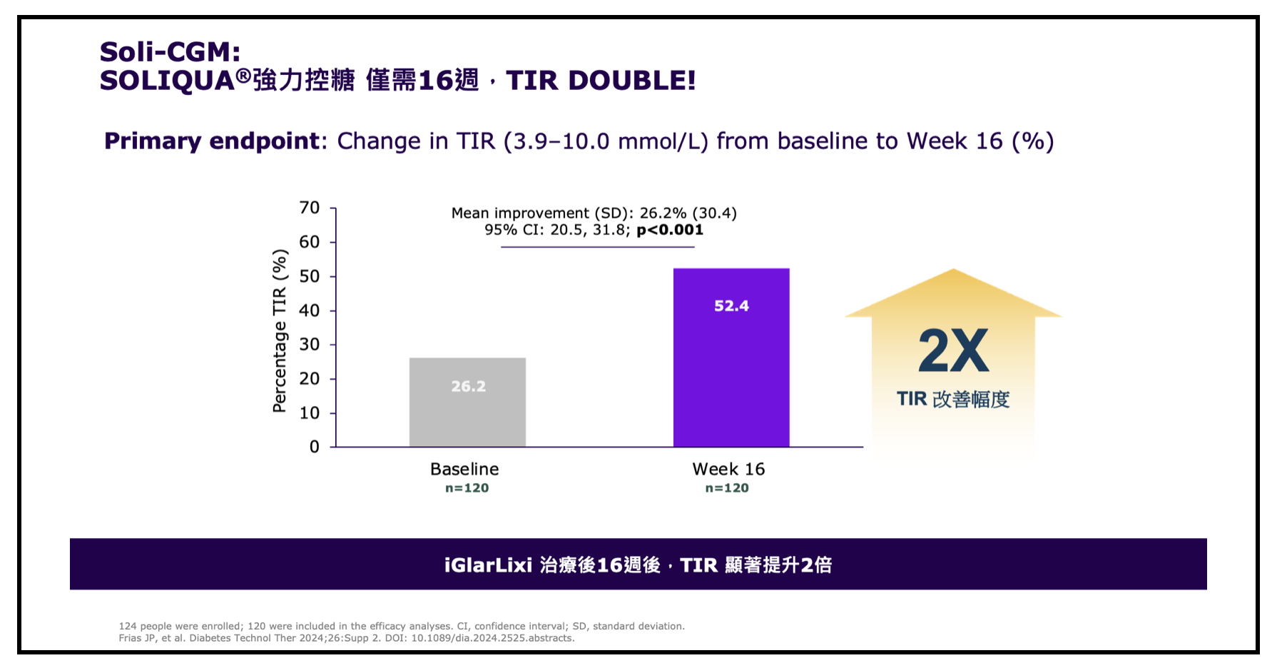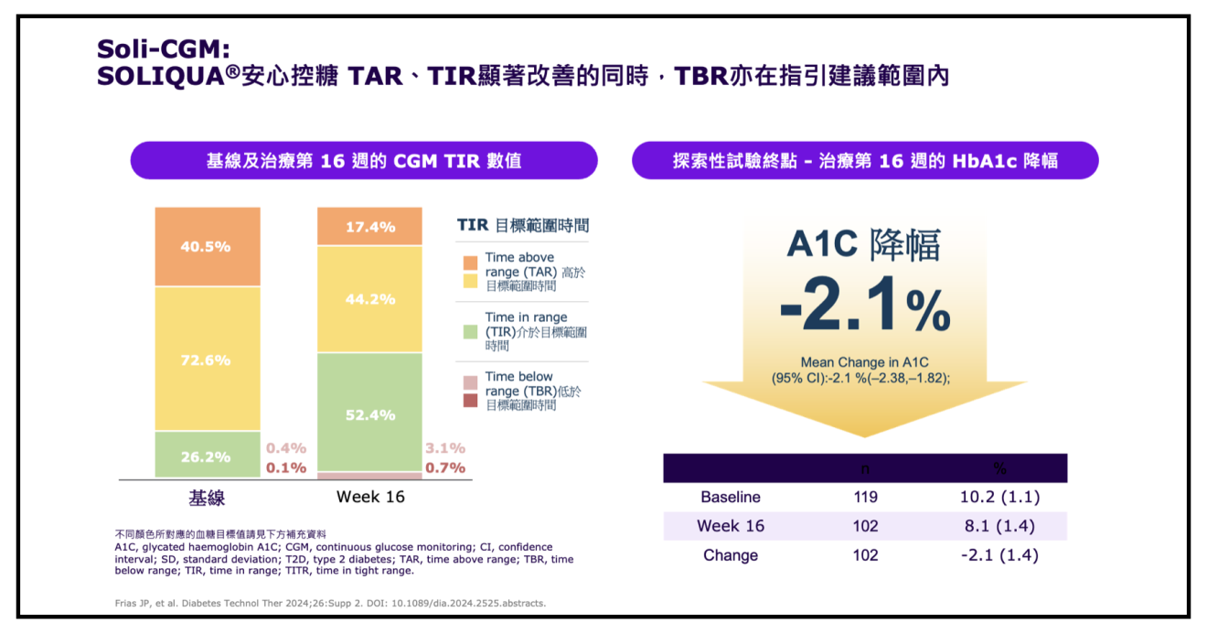 研究結果顯示,使用 Soliqua® 經過 16 周後,血糖目標範圍內時間 (Time in range, TIR) 大幅改善,糖化血色素也有明顯進步。