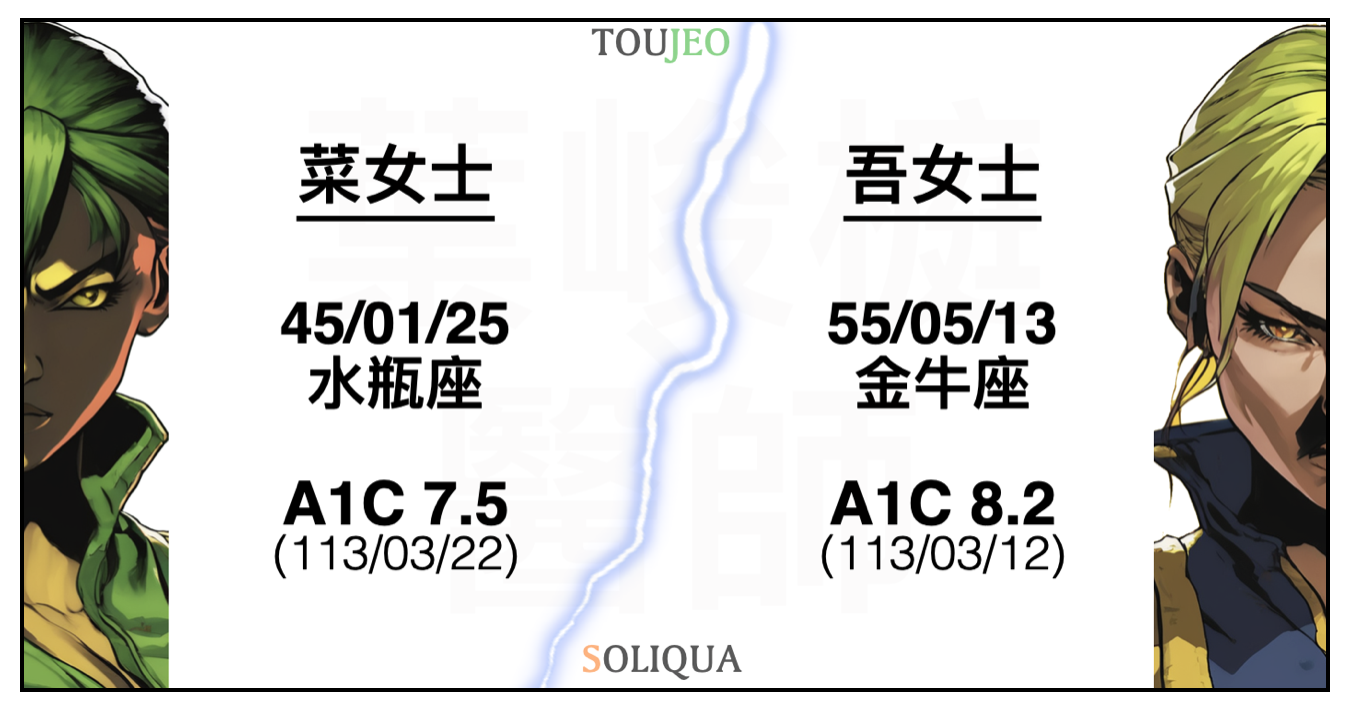 我提出了兩個糖尿病案例,都是使用雙效合一針劑 Soliqua®、併用口服藥物來控制血糖。同時,她們也安裝了連續血糖監測儀,紀錄 24 小時血糖波動。