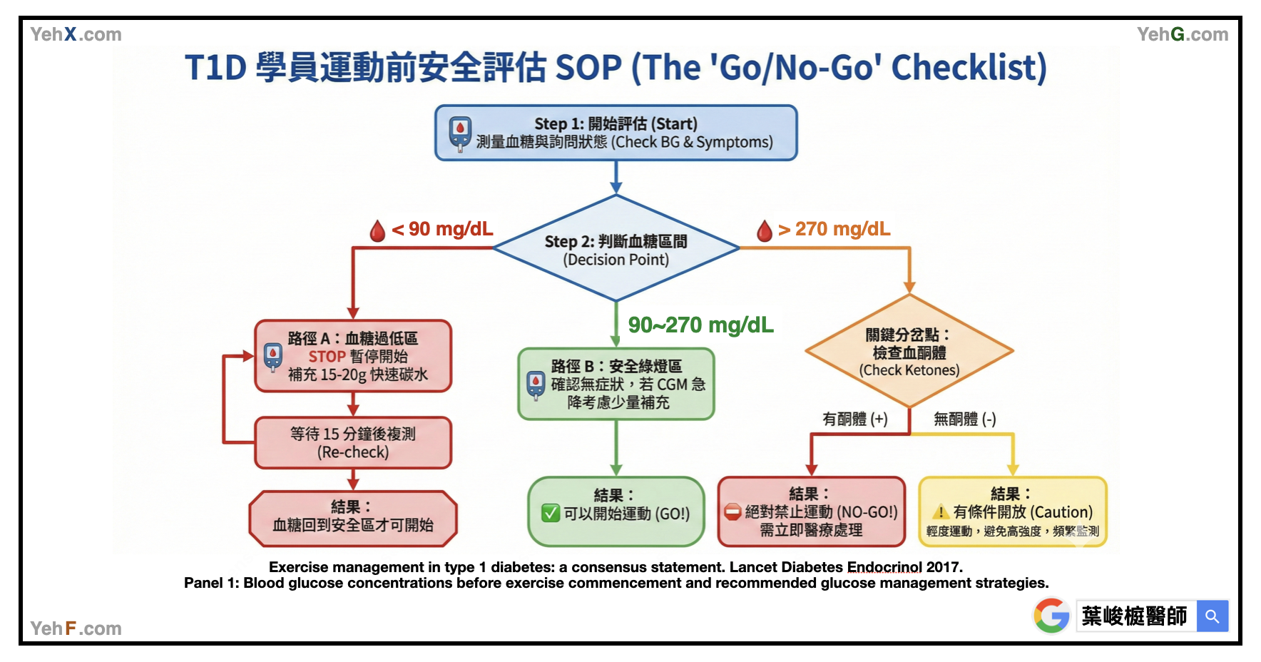 在開始任何運動前,必須進行「Go/No-Go 運動前安全評估」,確認當下的起步血糖區間: