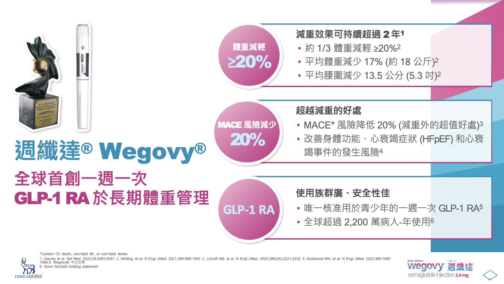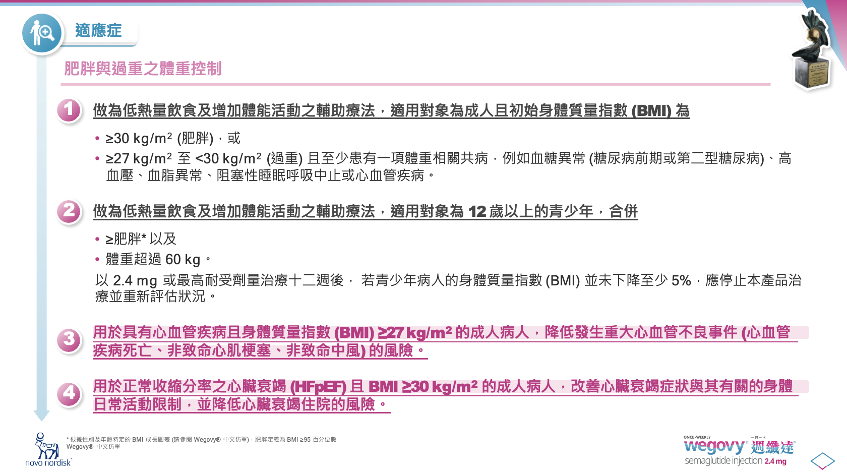 ⬧具有心血管疾病且 BMI ≥27 kg/m² 的成人病人,以降低發生重大心血管不良事件 (MACE) 的風險(包括心血管疾病死亡、非致命心肌梗塞、非致命中風)。