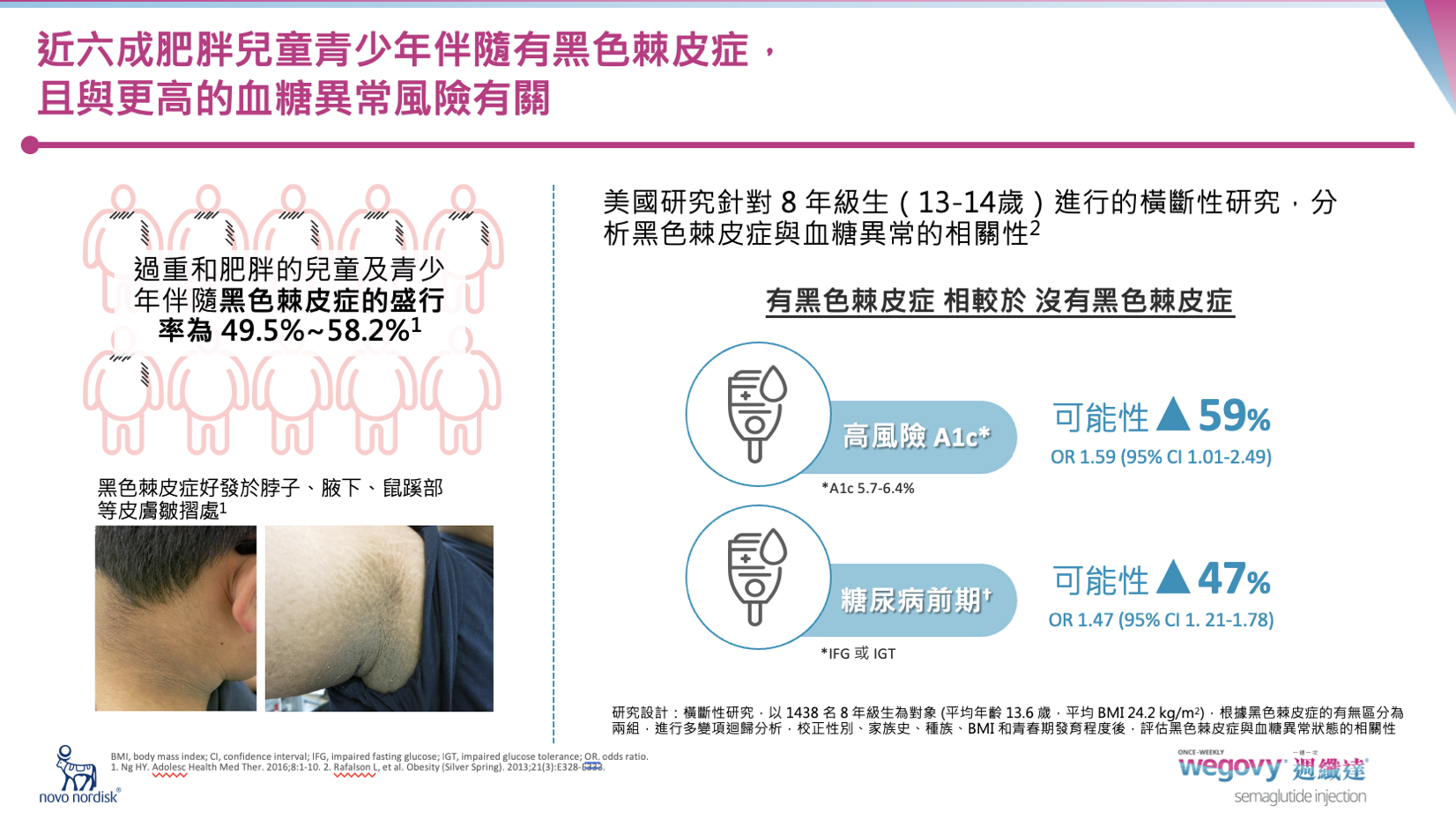 近六成肥胖孩童伴隨有黑色棘皮症(好發於脖子、腋下、鼠蹊部的黑色素沉澱),這是嚴重「胰島素阻抗」的警訊。有此症狀者,罹患糖尿病前期的風險高出 47%。