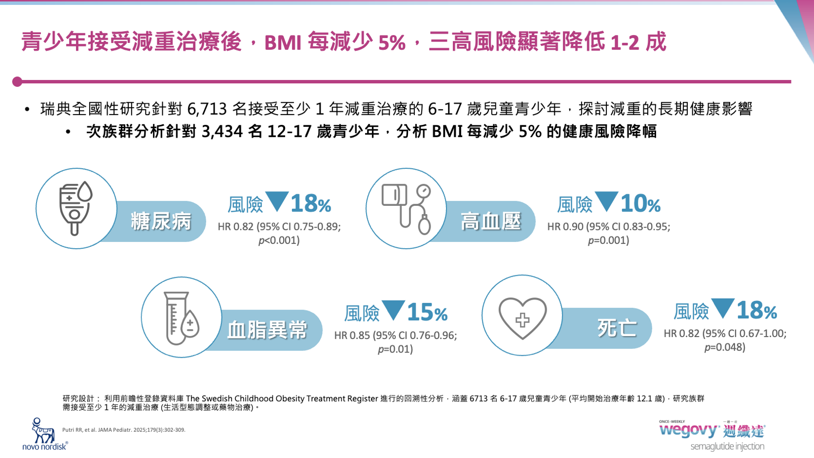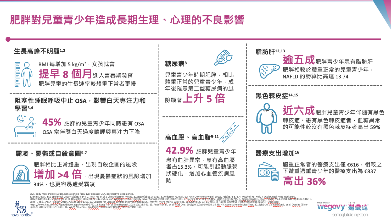 相比體重正常的孩童,兒童青少年時期肥胖,成年後罹患第2型糖尿病的風險會暴增 5 倍;此外,國外研究也顯示肥胖青少年易合併有非酒精性脂肪肝(NAFLD),肥胖兒童青少年族群的 NAFLD 盛行率為 34.19%。